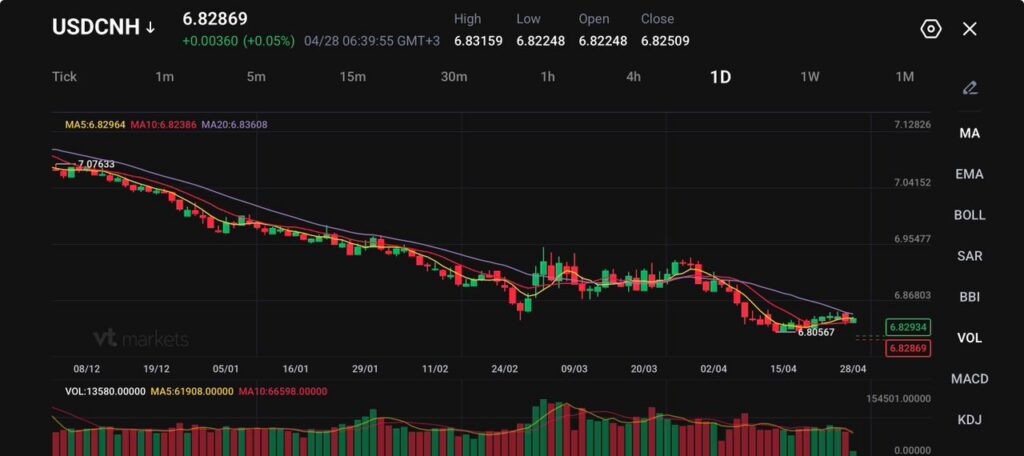 USDCNH scambia vicino a 6,8287, dopo un calo ordinato dai massimi di 7,07. Ora si muove lateralmente, mentre la pressione in vendita si attenua. Il trend di fondo resta ribassista, ma i movimenti recenti indicano una fase di consolidamento di breve periodo sui minimi (consolidamento: pausa con oscillazioni in un intervallo).